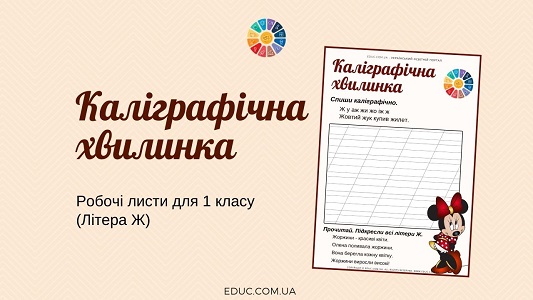 Каліграфічна хвилинка: робочі листи для 1 класу з завданнями на списування скадів і речень зі словами на букву Ж і завданнями прочитати речення і підкреслити всі букви Ж.