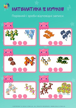 “Математика з Муркою” – завдання для дошкільнят і першокласників на порівняння чисел по малюнках.
