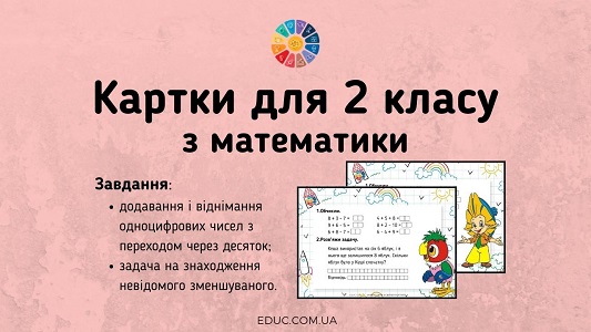 Картки для 2 класу з математики з завданнями на додавання і віднімання одноцифрових чисел з переходом через десяток і задачею на знаходження невідомого зменшуваного.