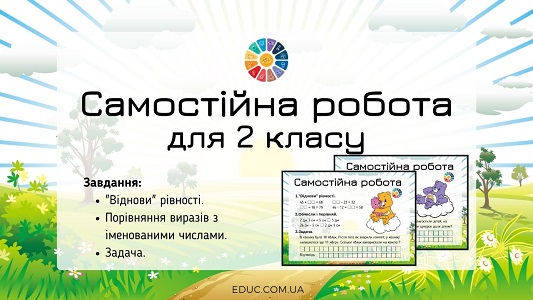 Самостійна робота для 2 класу в 2 варіантах з комбінованими завданнями: “відновлення” рівностей на додавання і віднімання двоцифрових чисел без переходу через розряд, порівняння виразів з іменованими числами, задача.