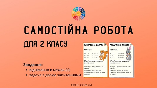 Головна » Завдання для дітей » Завдання для 2 класу » Самостійна робота для 2 класу: віднімання в межах 20 + задача