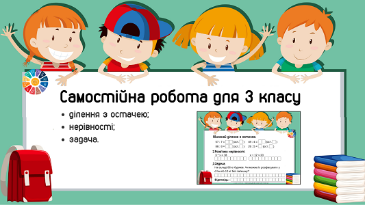 Головна » Завдання для дітей » Завдання для 3 класу » Самостійна робота: ділення з остачею, нерівності, задача